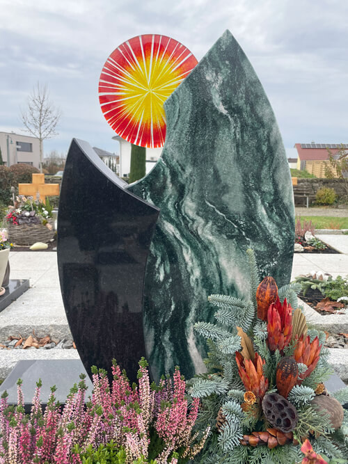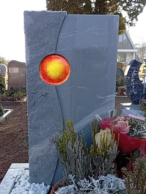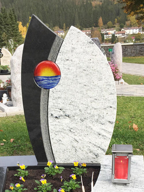 Grabsteine mit Glaskunst fallen auf jedem Friedhof ins Auge. Durch Lichteinfall sorgen die bunten Schmelzgläser für eine angenehme, beruhigende Atmosphäre.